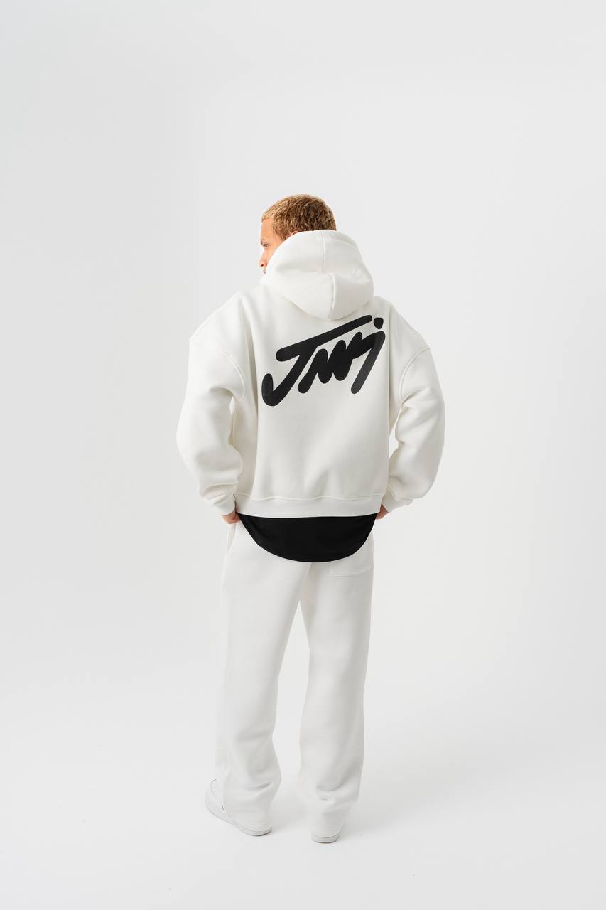 Görünüm: Beyazın temiz ve çarpıcı enerjisiyle, markanızın dinamik ruhunu birleştiren bu kapüşonlu sweatshirt (hoodie) ve eşofman altı takımı, sokak modasının en rahat ve dikkat çekici formu. Sırt baskısındaki güçlü siyah kontrast, bu seti anında bir statement parçası haline getiriyor.